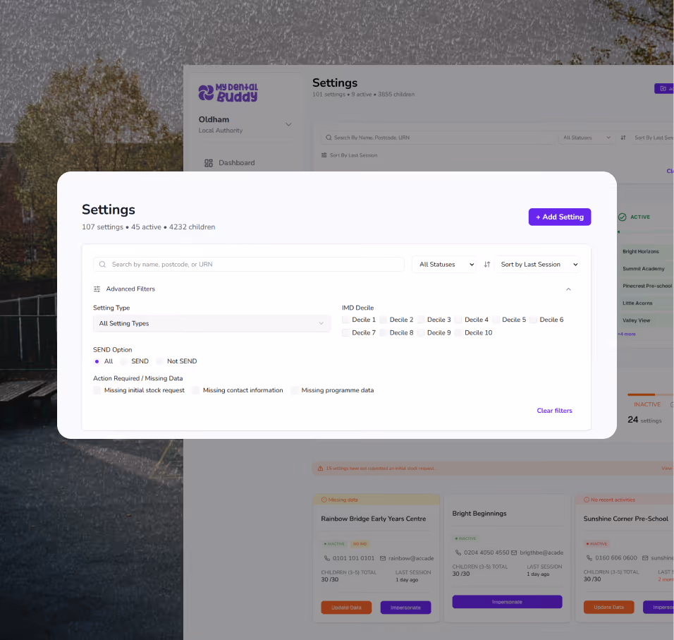 Manage hundreds of schools, nurseries, and early years settings from a single view. Add settings in bulk, track pipeline progress, and see exactly where every setting stands.